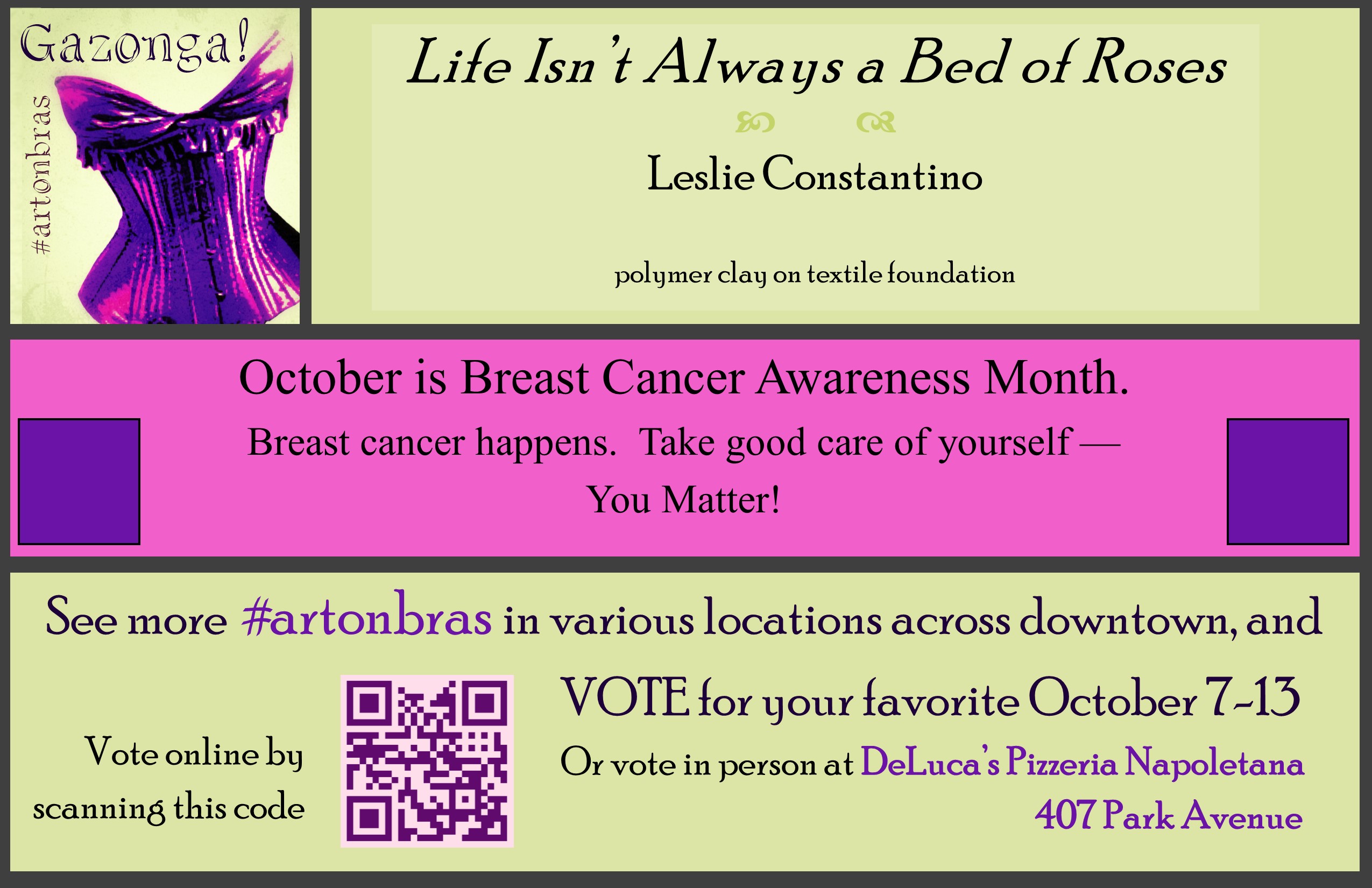At each installation site, a poster naming the artist and work, and providing a QR code for viewers to vote. The QR leads to a page at Shortstack.